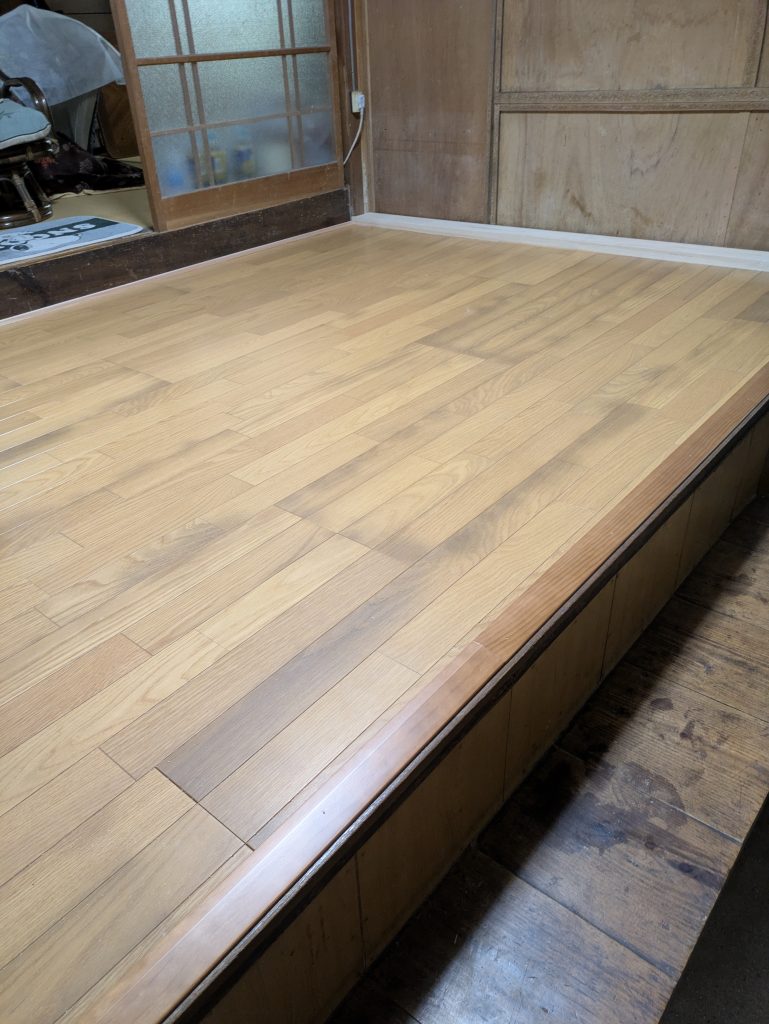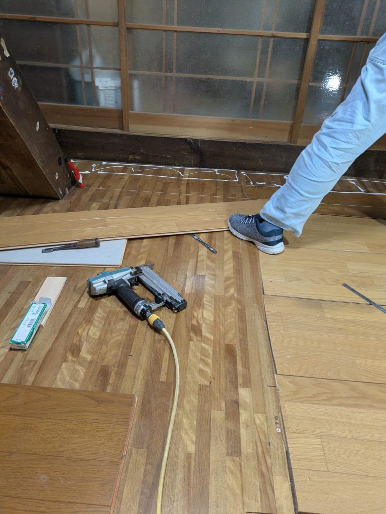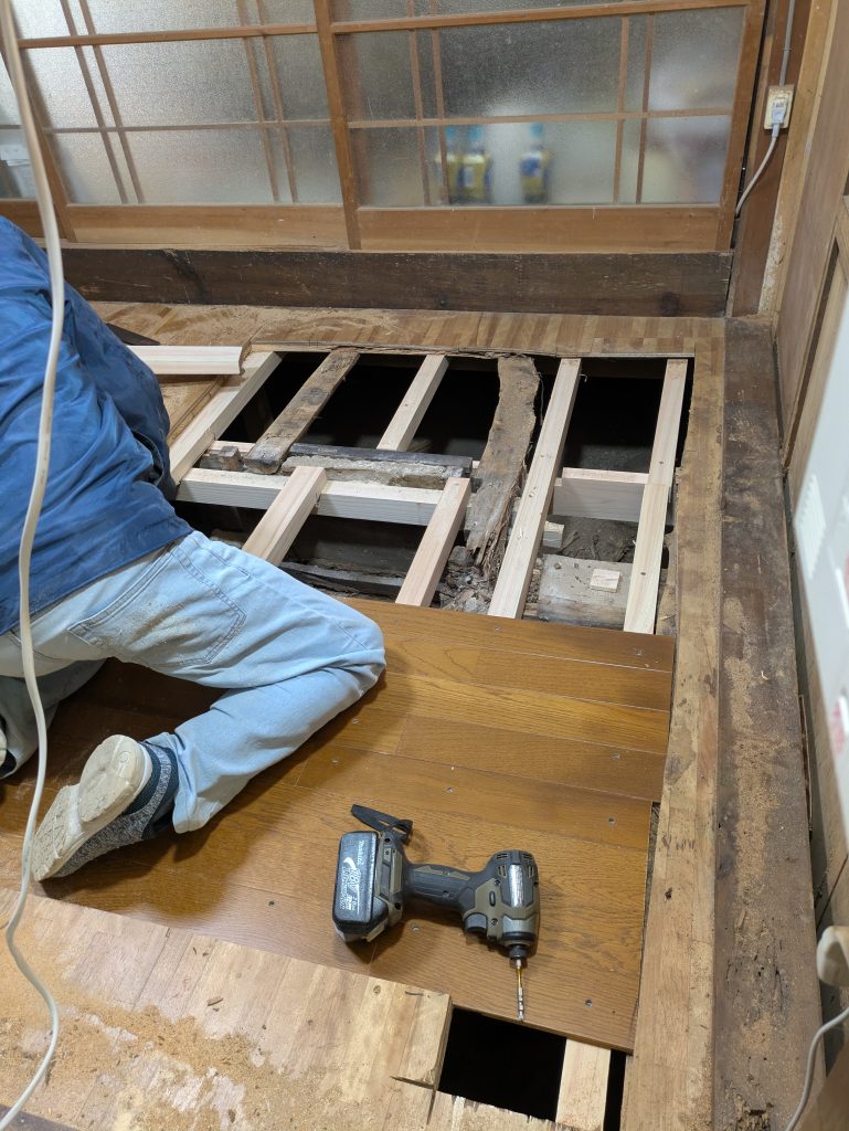 玄関ホール床と言っても、広くて座卓やこたつ持ってきても、みんながくつろげるし、食事もできるスペース。お盆、お正月は、みんなが帰ってきて集まるスペース。床をはぐってみると、意外と広範囲に白蟻にくわれてました。下地となる木材を補強し、周辺の床の高さに合わせて、フロアー材を張っていきました。おじいさんが保管していたフロアー材があり、大工さんにそれを使ってもらいました。何とかギリギリフロアー材がたりました。これでまた、みんなが集まるスペース確保。
