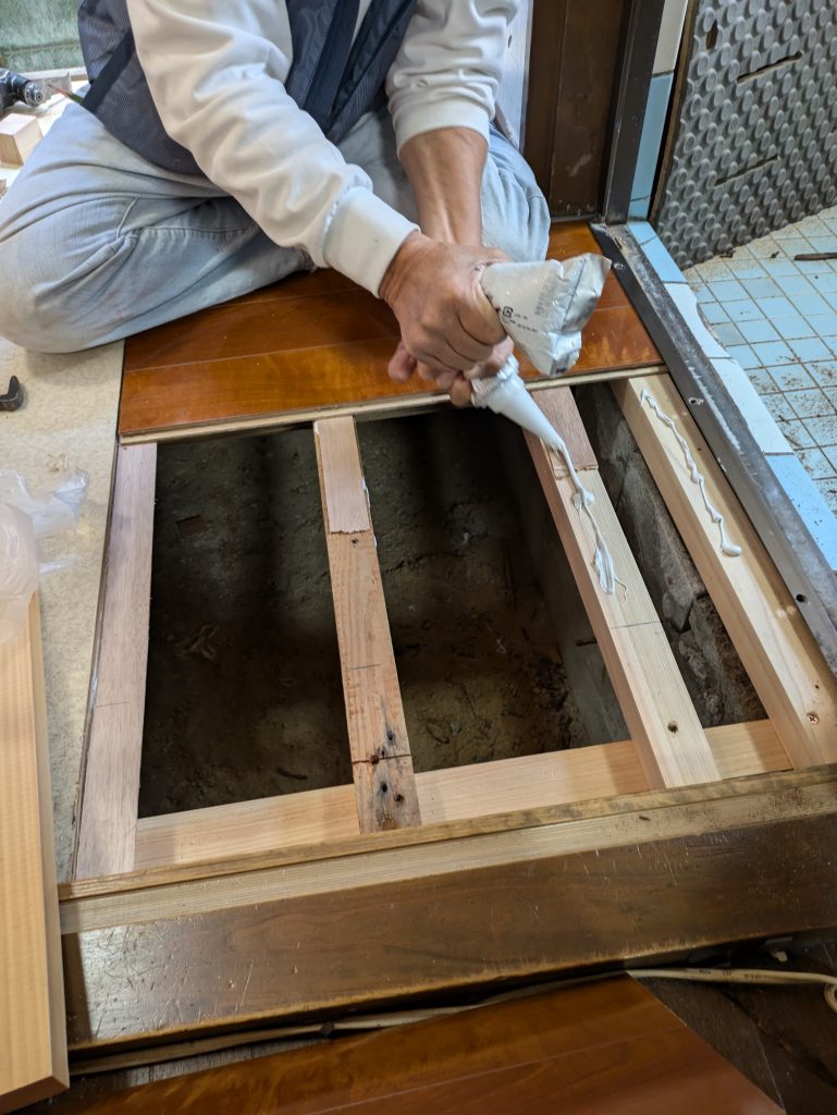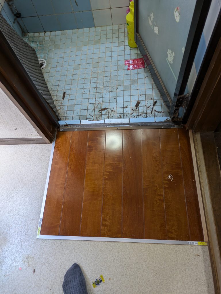 浴室前の洗面所床、一部修繕。 2025 12/30 Published 2025.12.30 / kouno \ この記事を共有 / B! リンクをコピーする 浴室前の洗面所床、一部修繕。 kouno B! リンクをコピーする 浴室入口前の洗面所の床は、どうしても、長年のうちに湿気で傷んできます。他の場所は、点検するとしっかりしているので、傷んでぼよぼよになっている所を撤去して、色違いになるけど、フロアー材を大工さんに張って貰いました。